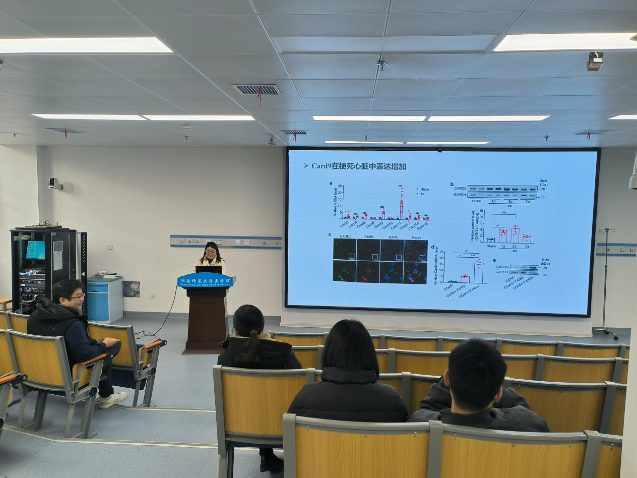 李敏琦同学对2023年发表在Signal Transduction and Targeted Therapy上的一篇研究性论文“Macrophage CARD9 mediates cardiac injury following myocardial infarction through regulation of lipocalin 2 expression”进行汇报。该论文由首都医科大学李玉琳团队完成,研究发现巨噬细胞CARD9可以通过调节脂钙蛋白2的表达介导心肌梗死后的心脏损伤。CARD9表达在心肌梗死后第1天显著升高,在心肌梗死后第7天下降。CARD9主要在F4 /80阳性巨噬细胞中表达。心肌梗死后28天,Card9基因敲除(KO)可改善小鼠左心室功能,减少梗死疤痕大小。此外,Card9 KO抑制心肌细胞边界区凋亡,减弱基质金属蛋白酶(MMP)的表达。RNA测序显示Card9 KO显著抑制心肌梗死后脂钙蛋白2 (Lcn2)的表达。巨噬细胞中均检测到Lcn2和受体溶质载体家族22成员17 (SLC22A17)。随后,作者证明Card9过表达增加了Lcn2的表达,而Card9 KO抑制了巨噬细胞中坏死细胞诱导的Lcn2上调,这可能是通过NF-κB实现的。Lcn2 KO在心肌梗死后表现出有益作用,重组Lcn2在体内降低了Card9 KO的保护作用。Lcn2 KO降低心肌梗死后巨噬细胞中MMP9的表达,Lcn2过表达增加MMP9的表达。在重组LCN2处理下,巨噬细胞中Slc22a17的敲除减少了MMP9的释放。上述研究为心肌梗死所致心脏损伤的发表机制提出了新的见解。