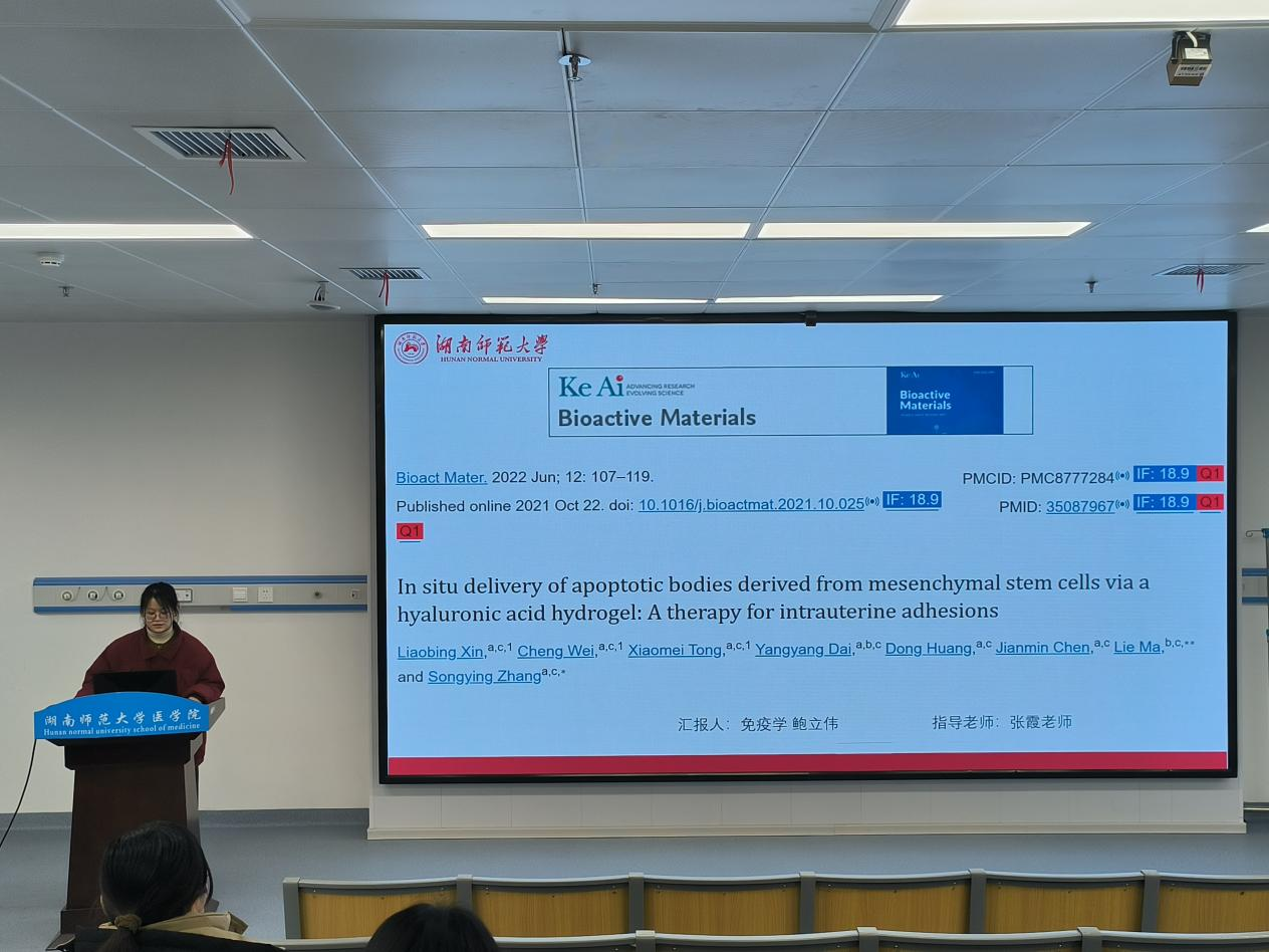 鲍立伟同学对2021年发表在Bioactive Materials上的一篇题为“In situ delivery of apoptotic bodies derived from mesenchymal stem cells via a hyaluronic acid hydrogel: A therapy for intrauterine adhesions”的一篇研究性论文展开汇报。该篇论文由浙江大学医学院张松英团队主导完成。作者证明凋亡小体(AB)通过增加体外受体细胞的线粒体生物能,对巨噬细胞免疫调节、细胞增殖和血管生成具有积极作用。通过将ABs与透明质酸(HA)水凝胶结合,开发了一种AB递送系统,其中HA促进AB保留并持续释放。在急性子宫内膜损伤的小鼠模型中,植入含AB的HA水凝胶可增加子宫内膜厚度和子宫内膜腺体数量,减少纤维化,并促进子宫内膜容受性和生育能力的恢复。在难治性宫腔粘连(IUA)大鼠模型中进一步证实了含AB的HA水凝胶的功效。携带抗体的HA水凝胶植入的体内机制与巨噬细胞免疫调节、细胞增殖和新生血管有关。本研究为子宫内粘连所致的女性不孕症的治疗提供了新的策略。