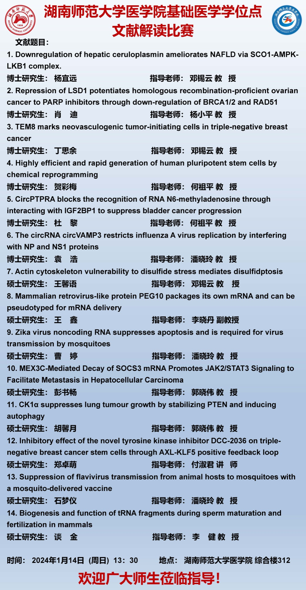 1月14日,基础医学学位点在综合楼312示教室举办首届文献解读比赛,来自基础医学专业的6位博士生和6位硕士生参与此次文献解读比赛。本次大赛旨在通过解读科研文献,培养医学生的科研思维和创新能力。基础医学学位点7位导师何祖平教授、余星教授、杨小平教授、徐坤教授、谷峰教授、郭晓伟教授、李健教授组成评委小组,院长何祖平教授担任评委小组组长。