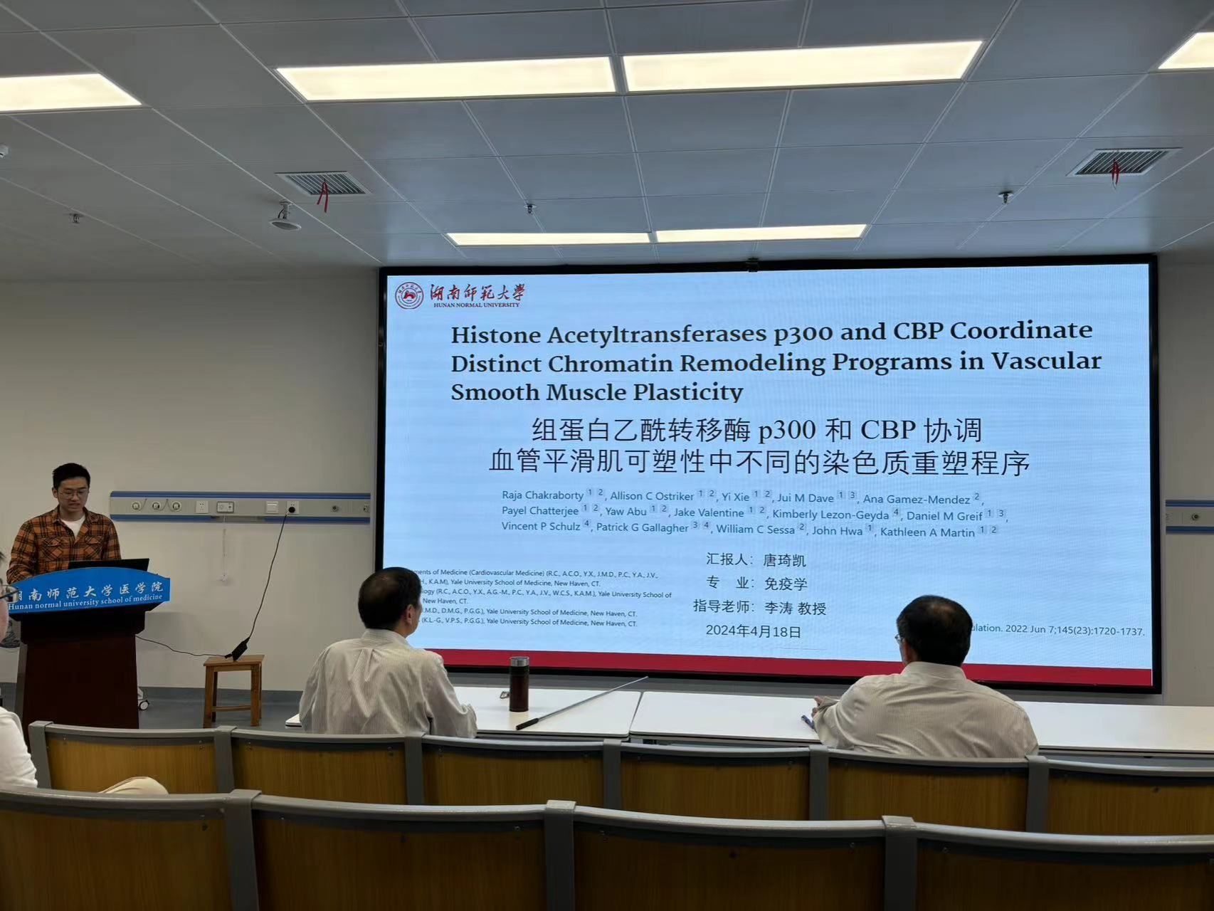 唐琦凯同学对2022年发表在Circulation上的一篇题为“Histone Acetyltransferases p300 and CBP Coordinate Distinct Chromatin Remodeling Programs in Vascular Smooth Muscle Plasticity”的一篇研究性论文展开汇报。本研究中,作者假设HAT介导的乙酰化调节是介导VSMC表型转换的关键,检测了p300和CBP在敲低的人VSMC、诱导性平滑肌特异性敲除小鼠(p300iKO或CBPiKO)以及人内膜增生样本中的作用,并研究了p300和CBP影响VSMC表型转换的机制。p300和TET2相互作用并增强彼此的功能,促进VSMC分化为收缩表型。而CBP增强可收缩基因启动子上的HDAC募集,促进VSMC去分化为合成表型。这些发现表明,染色质动力学的高度协调调节促进了VSMC的表型可塑性。本研究表明,p300和CBP在VSMC表型转换中具有非冗余和相反的功能,并通过与TET2或HDAC的不同功能相互作用协同调节染色质修饰。靶向特定的组蛋白乙酰转移酶可能对心血管疾病具有治疗前景。