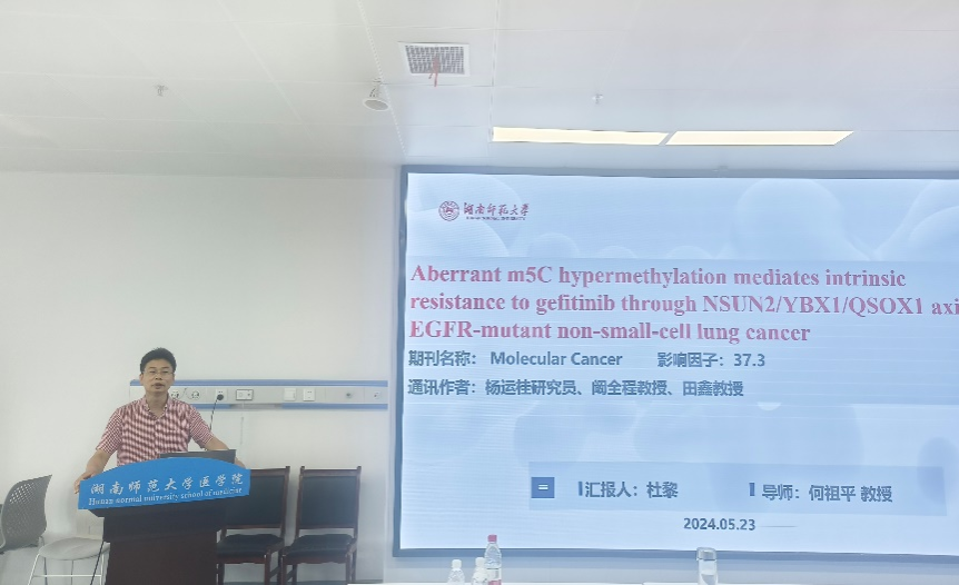 首先,博士研究生杜黎对2023年发表在Molecular Cancer的一篇研究性论文“Aberrant m5C hypermethylation mediates intrinsic resistance to gefitinib through NSUN2/YBX1/QSOX1 axis in EGFR-mutant non-small-cell lung cancer”进行汇报。该研究聚焦了当下热点甲基化及m5C调控,揭示了NSUN2-YBX1-QSOX1轴是一种以前未被发现的调节NSCLC对EGFR-TKIs内在抗性的机制。抑制NSUN2-YBX1-QSOX1轴在m5C依赖性吉非替尼耐药中发挥了固有的调节作用。强调了NSUN2-YBX1-QSOX1轴作为对EGFR-TKIs具有内在抗性的NSCLC患者预后和治疗的候选生物标志物。