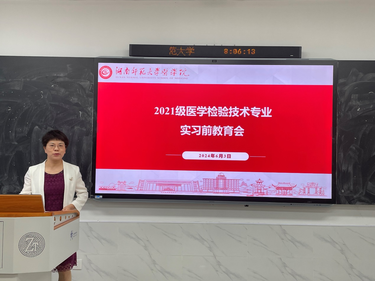 6月3日上午,为了提升同学们的专业情怀、职业素养和安全意识,更好地从容适应即将到来的专业实习,医学检验系联合实习办、学工办等共同开展了2021级医学检验技术专业本科生实习前教育培训。永利集团官网党委书记鄢朝晖、检验系主任叶湘漓、班导师代表钟志宏、廖旻晶、学工办主任张晓红和实习办主任赵燕玲参加本次教育培训。