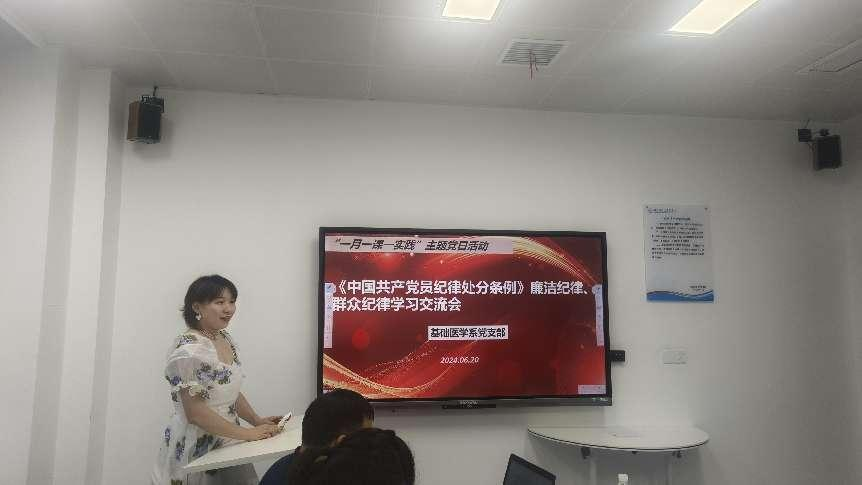 2024年6月20日,基础医学系党支部在综合楼227召开党员大会,集中学习《中国共产党纪律处分条例》中的廉洁纪律、群众纪律内容。首先,由支委组织全体党员认真学习新修订的《中国共产党纪律处分条例》中规定的廉洁纪律、群众纪律以及就学习落实《条例》的重要意义进行了详细讲读。