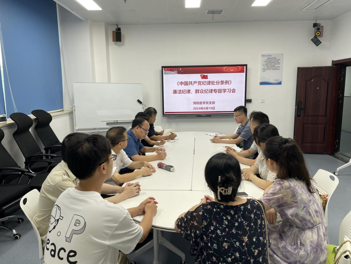 6月19日下午,预防医学党支部在227会议室召开了《条例》廉洁纪律和群众纪律专题学习会。会议旨在深入学习领会《条例》中的廉洁纪律和群众纪律要求,推动全体党员干部自觉遵守党的纪律,密切联系群众,为学院的健康发展提供坚强保障。预防医学系全体党员教师,院党委副书记陈松出席参加了会议,会议由预防医学党支部书记陈适主持。