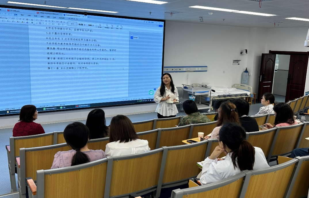 余星副院长就研究生教育和管理发展的新形势发表了讲话,同时从遵守规章制度、加强师德师风建设及提高业务素养等方面对各位导师做出了明确要求。王卫红教授对护理硕士专业学位研究生培养方案、学位基本要求、临床实践大纲以及临床实践考核办法进行了详细解读。学位点秘书王晓芬从研究生毕业论文书写要求、导师考核要求进行了文件分享。何平平教授强调各位导师应不断加强自身业务素质,提高研究生培养质量,将研究生培养与学位点建设相融合,同时还要多关注学生的身心健康。