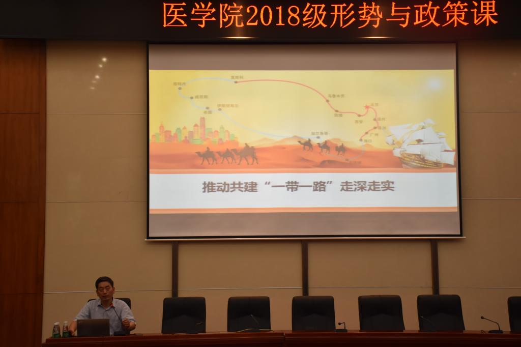 5月27日中午,副校长黎大志在永利集团官网学术报告厅为2018级学生讲授题为“推动共建‘一带一路’走深走实”的“形势与政策”课。