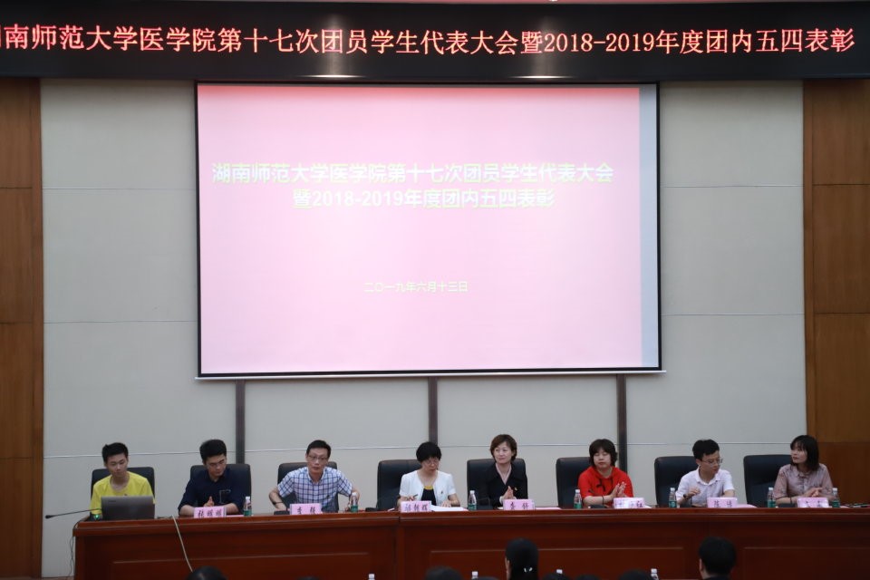 6月13日17点,永利集团官网第十七次团员学生代表大会暨2018-2019年度团内五四表彰在仁医楼报告厅举行。校团委书记龚舒、院党委书记鄢朝晖、院学工办主任张晓红、院团委书记李强、兼职团委副书记、青年博士陈适、学工办副主任张明明、团委副书记文敏出席大会。