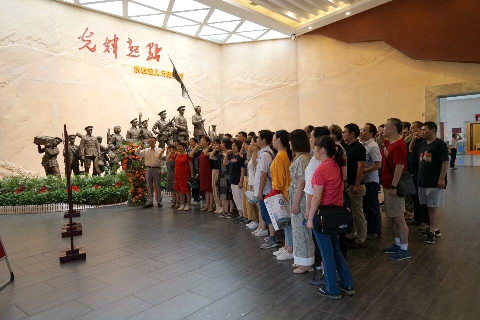 在文家市秋收起义纪念馆,全体党员庄重举起右手,重温入党誓词。在纪念馆内,大量的照片、文献、实物等史实材料与图表、绘画等辅助展品全面真实地展现了秋收起义光辉历史,大家驻足在那一幅幅壮烈的革命历史画面前,仿佛看到了秋收起义炮火纷飞的壮烈场面。读着那一个个革命将士的名字,大家心中升腾起对革命先烈的缅怀之情和由衷敬仰,深刻体会到革命历程的曲折艰难和革命胜利的来之不易。
