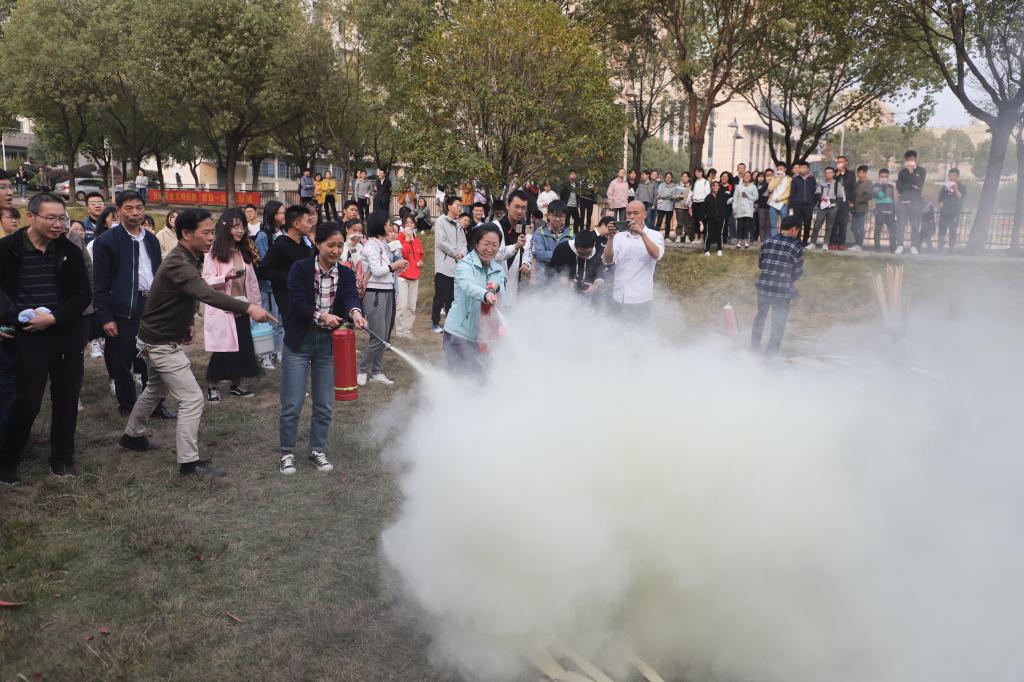 随后,开启消防应急演练。全体人员严格按照消防疏散应急预案,迅速到达指定岗位。随着烟幕弹的点燃,警报声响起,演练师生用毛巾捂住口鼻,弯着腰快速、有序撤离到安全地带,并在到达安全点后立即清点人数向教官进行汇报。集合完毕后,唐教官对本次疏散演练进行了总结,他对永利集团官网高度重视消防安全工作,应急演练的精心组织和师生的有效配合给予高度肯定,希望全体师生不断提高消防意识与能力,积极开展消防演练,防患于未然。教师、学生也分别派代表,在唐教官的指挥下进行灭火器的规范操作和使用。