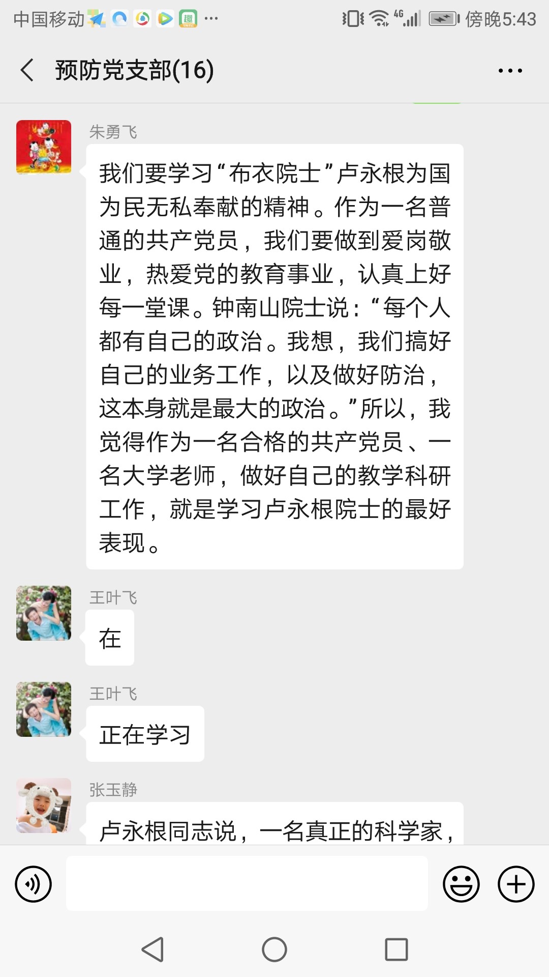 在线研讨会上,每位党员同志通过认真学习卢永根同志的优秀事迹,紧密结合自身工作实际,谈体会,谈感想。大家踊跃发言,认为卢永根同志一心向党、一生爱国、一心治学、一世恭俭,他用毕生的言行向世人诠释了一位老党员、老科学家、老教育工作者科技报国的赤诚之心。他是永葆初心矢志奋斗的布衣院士,是习近平新时代中国特色社会主义思想的坚定信仰者和忠实实践者,是共产党人不忘初心、牢记使命、永远奋斗的时代楷模。大家纷纷表示,作为一名共产党员和一名大学老师,我们要以卢永根院士为榜样,不忘初心、牢记使命,时时践行共产党员的责任与担当;立德立教、为人治学,把教书育人放在教育工作第一位;爱党爱教、潜心钻研,为科技教育事业作出贡献;勇于担当、甘于奉献,弘扬社会主义正能量。