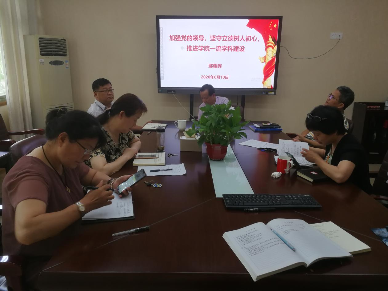 2020年6月10日上午,永利集团官网召开本学期第一次中心组学习(扩大)会,党委中心组全体成员和院长助理及党委办、行政办主任参加了中心组学习。本次会议采取线上结合线下方式举行,院党委书记鄢朝晖主持会议。