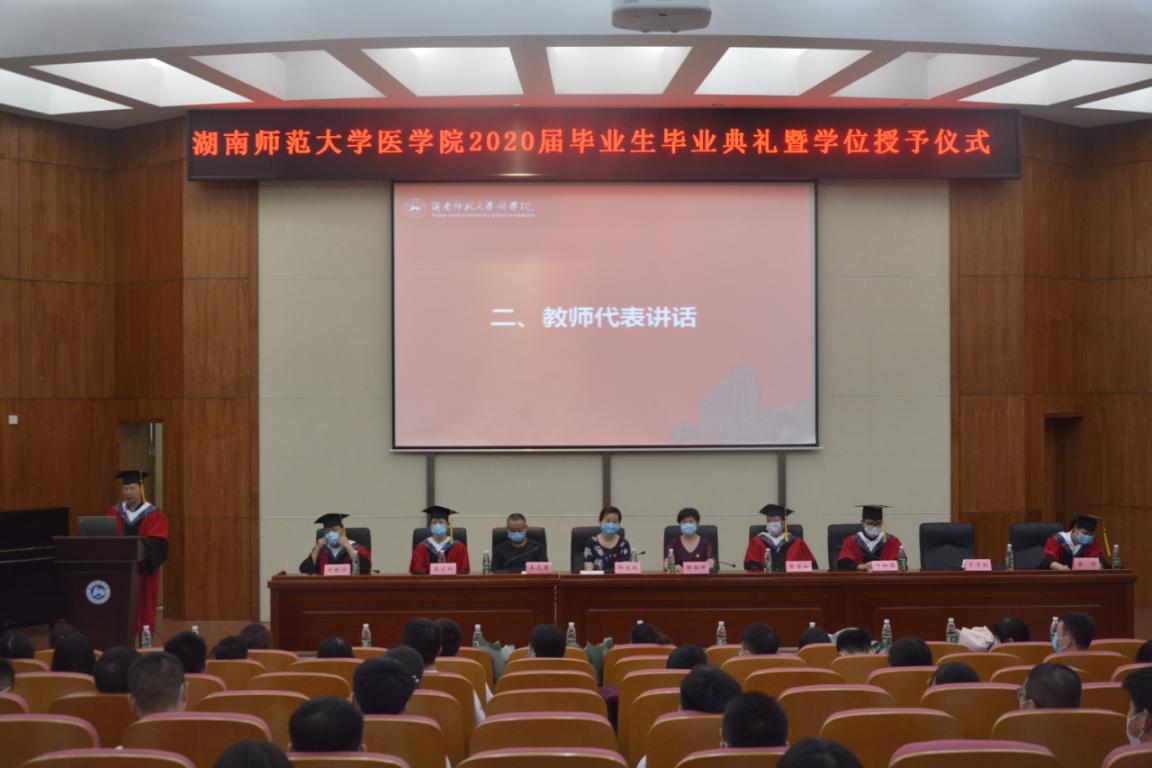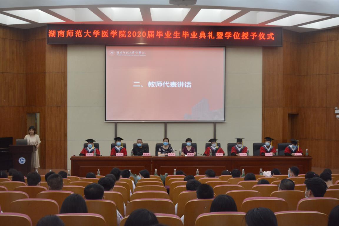 院党委书记鄢朝晖代表学院发言,她希望同学们在开启人生新篇章的征程中牢记母校“仁爱精勤”的校训精神,牢记母院“勤诚谨毅”的医教传统,心系家国民生,志在兼济天下,以己之所学,服务一方山水、造福一方百姓,坚持医学志向,探求医学真谛,不忘医者仁心,做一名骄傲的、有为的、光荣的湖南师大人!