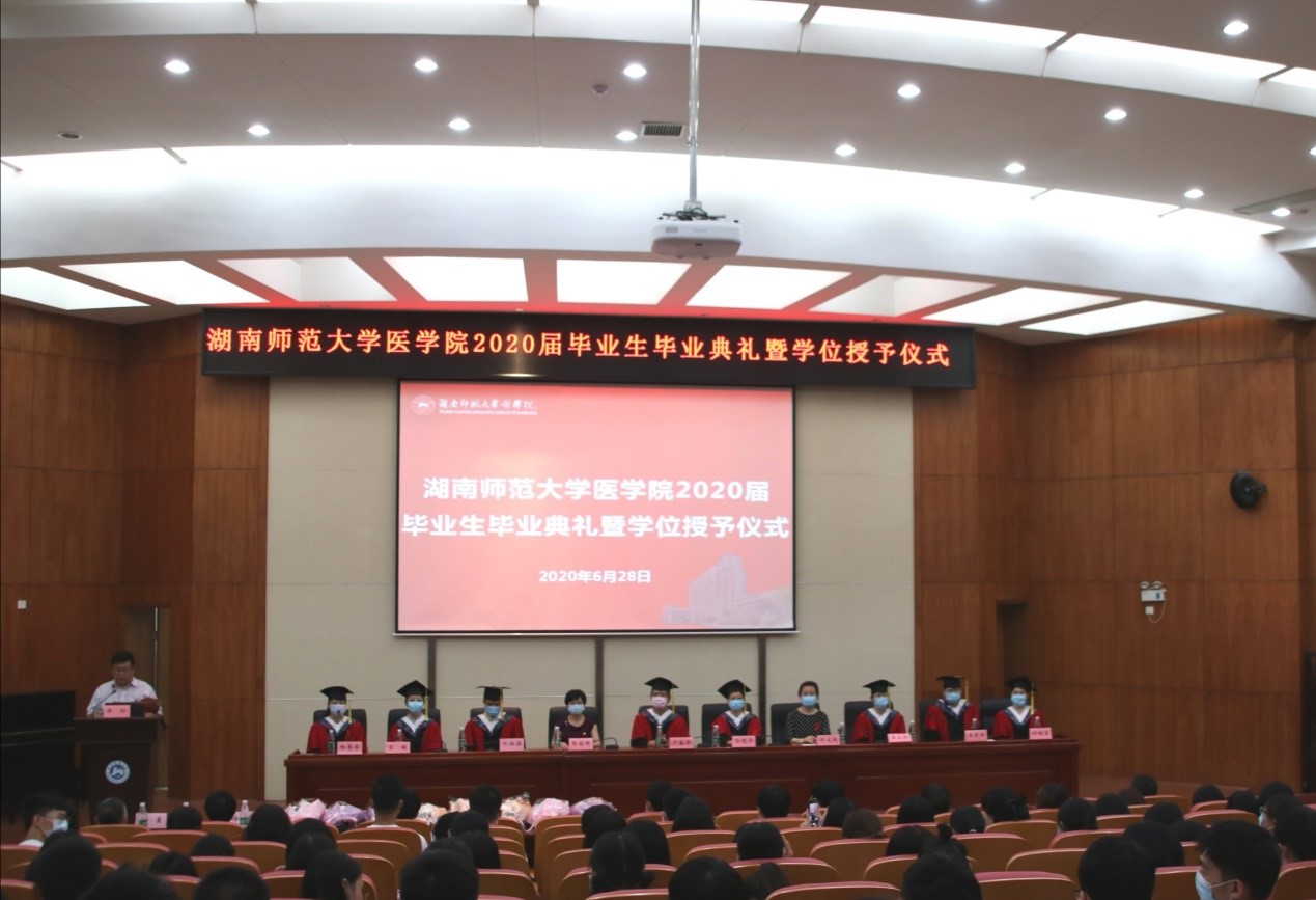 6月28日上午,永利集团官网2020届毕业生毕业典礼暨学位授予仪式在仁医楼学术报告厅隆重举行。309名本科生以及47名来华留学生分别以线上或线下的方式参与了此次仪式。原永利集团3044官网欢迎您常务副校长卢岳华、原永利集团官网院长符晓华、院党委书记鄢朝晖、副院长邓文艳、院长助理叶湘漓、检验医学系主任王庆林、护理系主任王卫红、药学系主任冯星、预防系主任刘桃成、药学系老师何纯莲、预防系老师吕媛老师、基础医学系杨粤军老师出席此次会议,校友代表、湖南省人民医院急诊ICU徐芙蓉护士长应邀参加此次会议。院党委副书记陈松主持本次仪式。