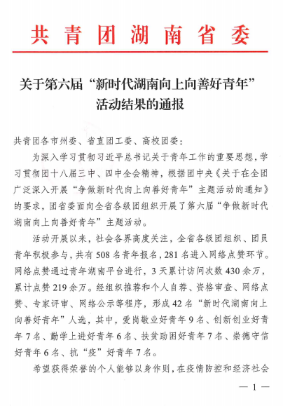 近日,从共青团省委传来好消息,永利集团官网青年教授潘晓玲在第六届“新时代湖南向上向善好青年”活动评选中,被授予“创新创业好青年”光荣称号。