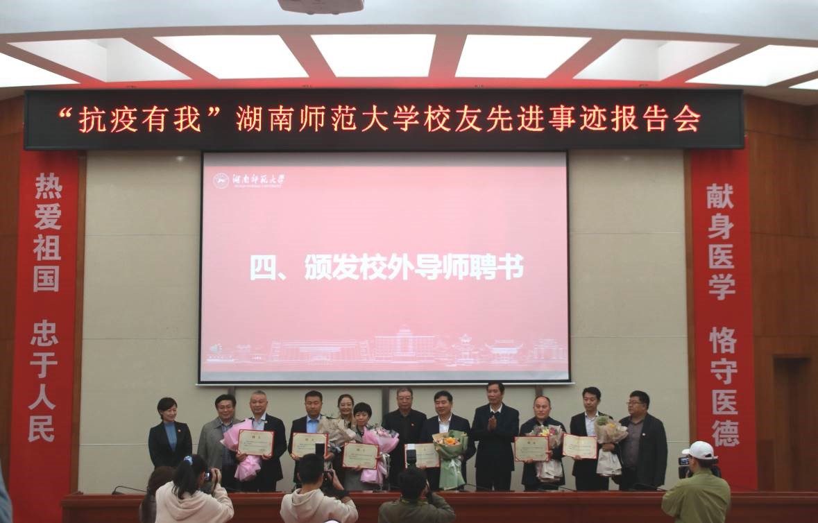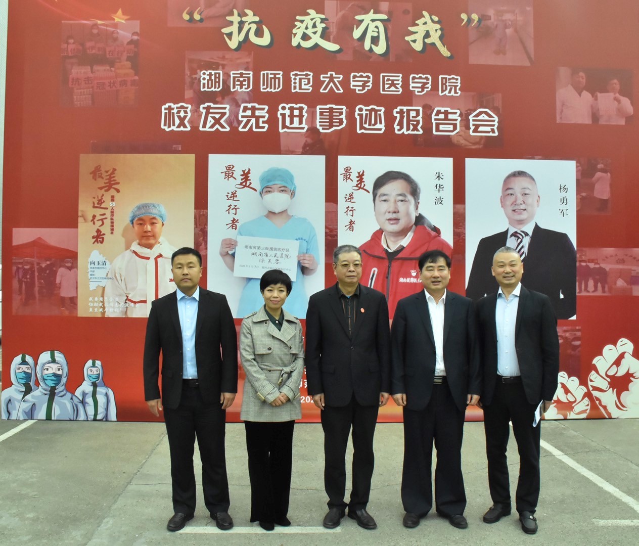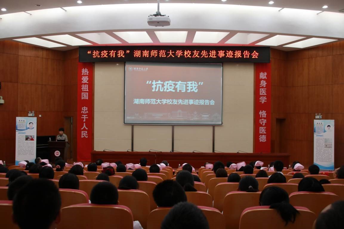 为深入贯彻习近平新时代中国特色社会主义思想,大力弘扬伟大抗疫精神,深入开展爱国主义教育,10月8日下午,“抗疫有我”——永利集团3044官网欢迎您校友先进事迹首场报告会在永利集团官网仁医楼报告厅隆重举行。我校附属第一医院党委委员、临床医学院党委书记朱华波,附属第一医院急诊重症监护室护士长徐芙蓉,吉首市疾控中心慢性病防治科科长向玉清,湖南润吉药业有限公司总经理杨勇军,湖南康寿制药有限公司执行董事、总经理谈发金,深圳利尔阳光科技有限公司董事长仇建波,我校副校长周俊武,原副校长瞿树林,校党委委员、宣传部部长晏昱,校友总会秘书长杨玲、学工部部长向发意、团委书记龚舒等出席会议。会议由永利集团官网党委书记鄢朝晖主持。