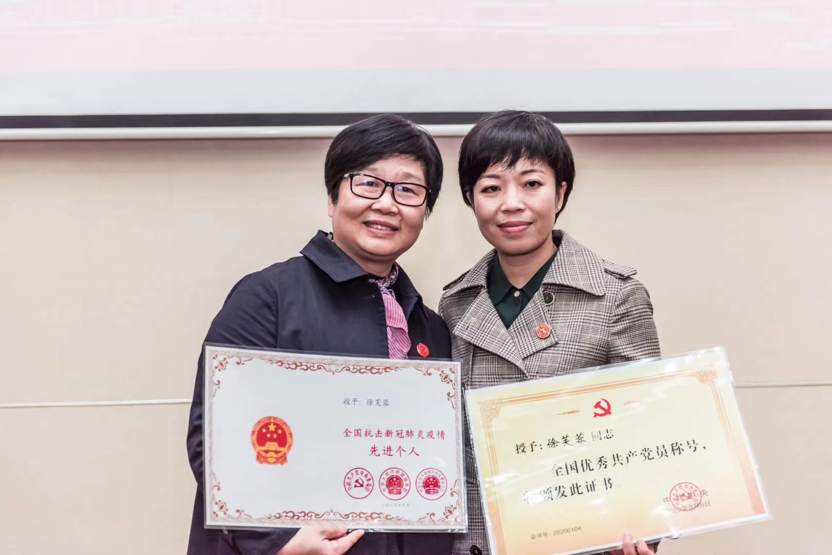 徐芙蓉将“全国抗疫先进个人”“全国优秀共产党员”荣誉证书复制件捐献给母校,杨玲代表学校接受捐赠证书。