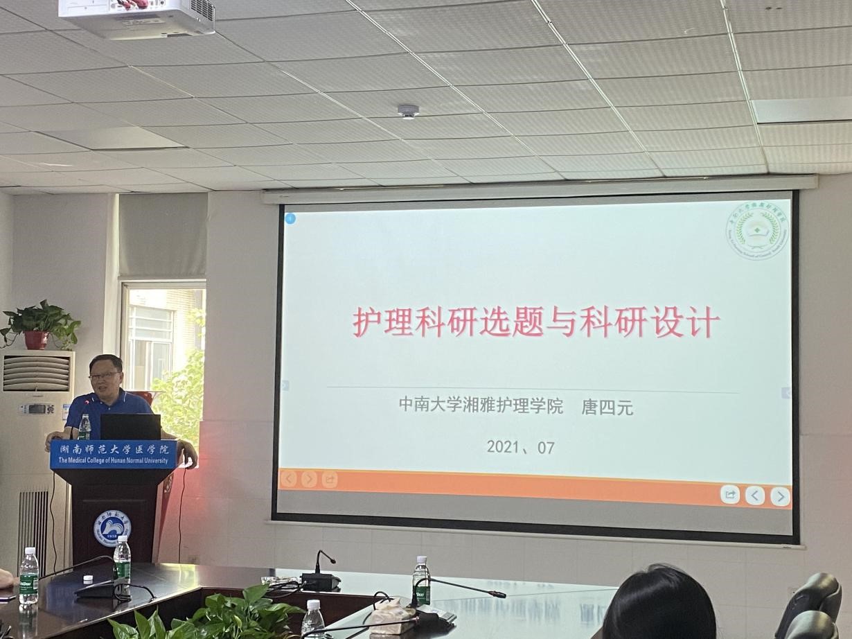 7月6日下午,中南大学湘雅护理学院院长、国务院特殊津贴专家、博士生导师唐四元教授莅临永利集团官网做主题为《护理科研选题与科研设计》的学术讲座。永利集团官网副院长张坚松主持讲座,护理系教师及研究生共同听了此次讲座。