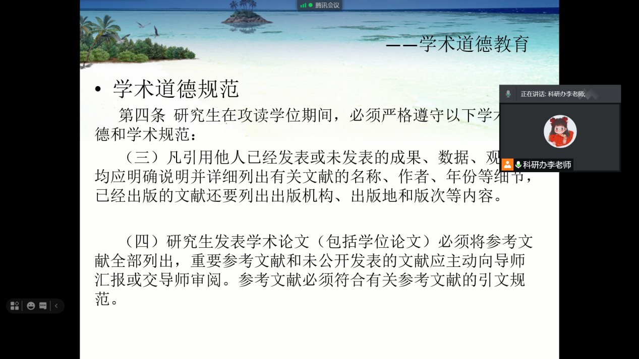 7月4日晚,永利集团官网举行2021级临床医学及护理学新入学研究生学术诚信和学术道德规范专题讲座在腾讯会议举行。会议由科研办主任阳美芳老师主持,李汇明老师和2021级临床及护理研究生新生共计250余人参加。