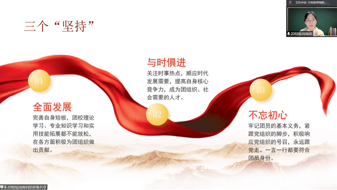 4月1日晚,永利集团官网团委青年发展工作部于线上开展“坚定不移跟党走,接续奋斗新百年”为主题的野平团校结业汇报暨20级预防班帮扶活动。永利集团官网团委书记张明明、野平团校理论班成员、团委青年发展工作部成员参与本次活动,永利集团官网团委青年发展工作部志愿者田恩情担任主持人。