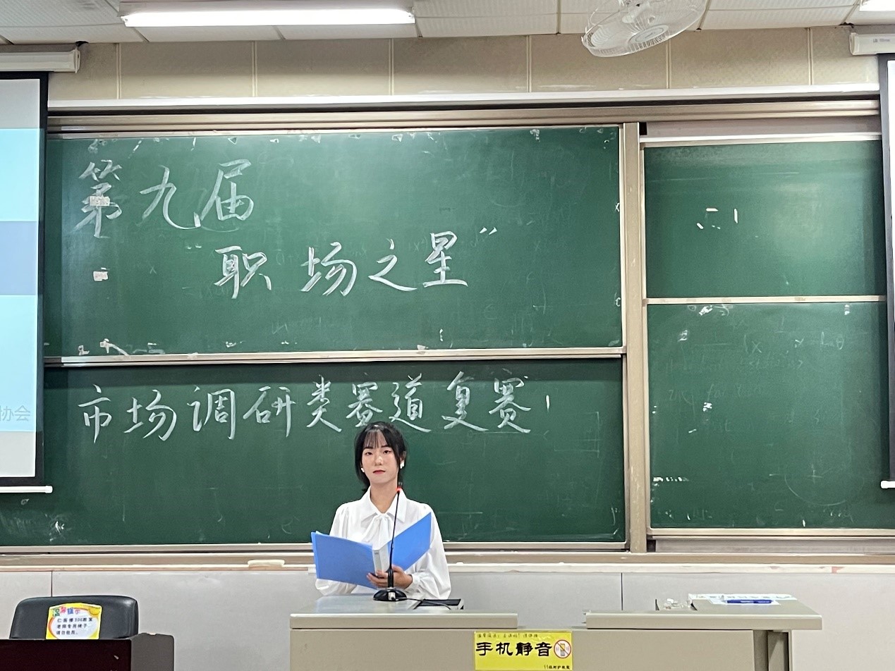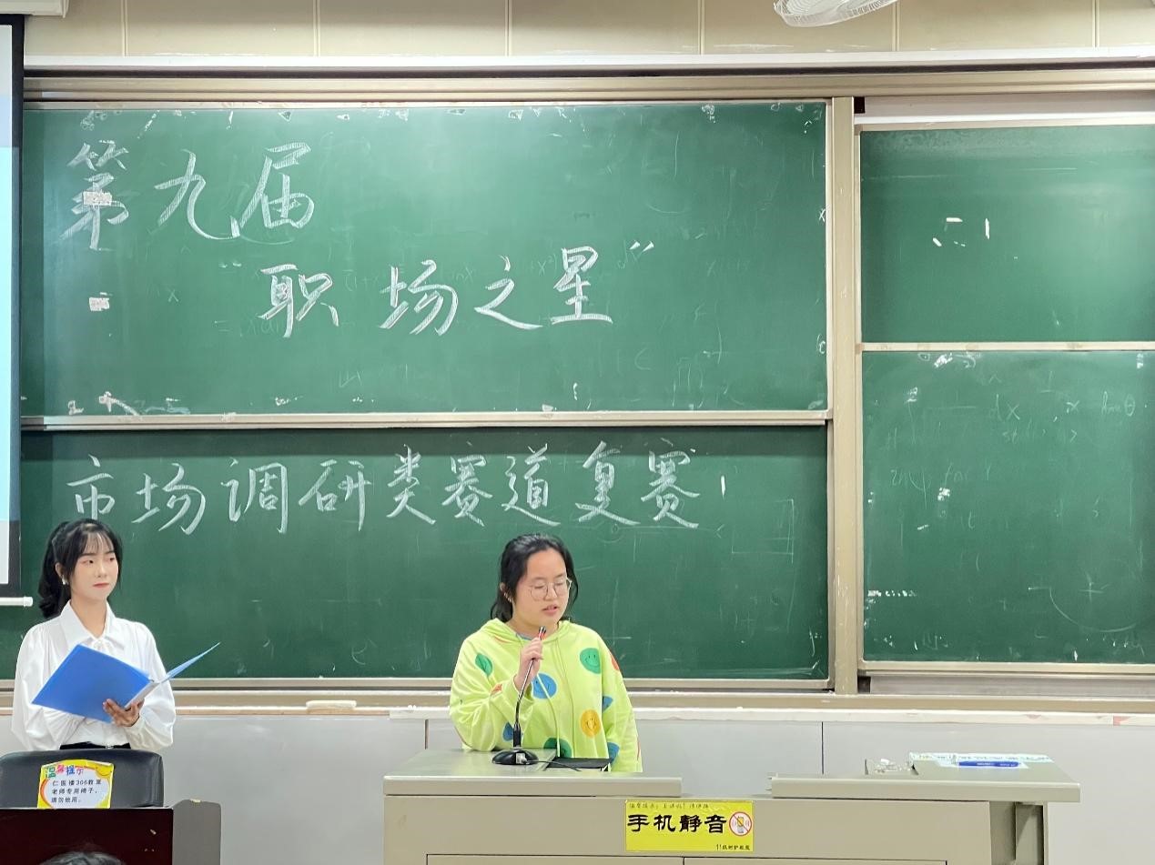 比赛伊始,主持人何兰介绍了此次比赛的流程与评分细则。此次比赛共分设“职无不言”、“勇往直前”和“问答时刻”三个环节。五名参赛选手依次上台向评委与观众作三分钟的自我介绍后,从市场调研题库中随机抽取相关问题并作答。在“问答时刻”中,评委根据选手的表现进行提问,由选手回答。最终,评委综合选手三个环节的表现进行打分,逐出比赛结果。