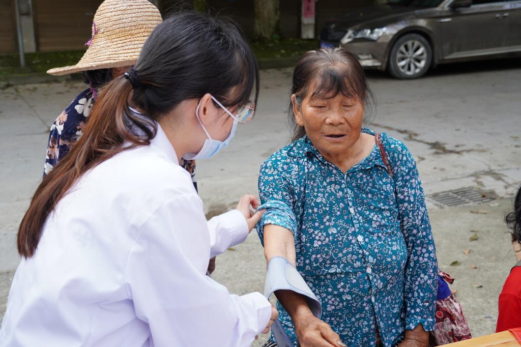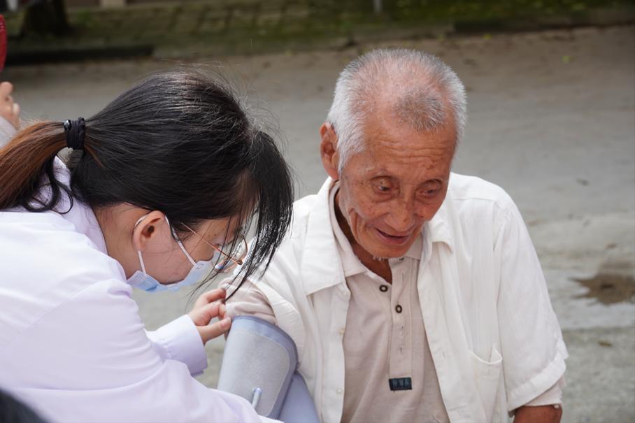 活动开始时,健康宣教小组所有成员身穿白大褂,戴好口罩,准备义诊仪器和记录居民健康情况数据的设备,在镇中心布置场地,致力于为鹿原镇居民提供免费而高质量的义诊服务。活动进行时,队员响应积极,当地居民踊跃参与。本队队员热情认真地为前来的居民测量血压、血糖、视力水平等数据。测量数值后,队员们仔细询问居民生活作息习惯等细节,根据测量数据和居民的回答提供具有针对性的医学建议,致力于帮助广大居民培养健康合理的生活习惯,拥有一个健康的身体。前来的居民都对我队成员的工作表示了支持、肯定和感谢。