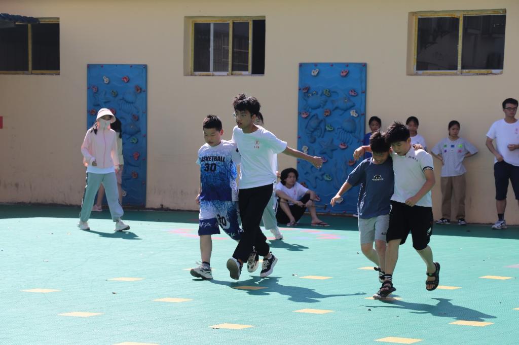 学生们来到教室后,戴思宣布趣味运动会正式开始。比赛项目依次为两人三足、迎面接力、混合蛇战以及面对面传球。在单个项目开始前,李冰倩宣布比赛规则和注意事项,在进行分组后带领小朋友有序进入比赛场地,分组次进行竞赛。“两人三足”中将两位同学一足绑在一起进行定点赛跑;“迎面接力”则是互传接力棒赛跑,用时最短者获胜,这两个项目主要考验伙伴间的团结协作能力。“混合蛇战”中各组同学尽情奔跑,保护队尾成员不被其他队伍抓捕,获胜主要取决于同学们内部的排兵布阵和比赛策略。“面对面传球”时同学们用各种各样的姿势传运篮球直至抵达终点,锻炼了孩子们的肢体协调能力和团队配合能力。四个比赛项目结束,戴思统计分数后,黎姿为获胜的小朋友们颁发奖品。此次活动的所有奖品为我校同学友情捐赠。