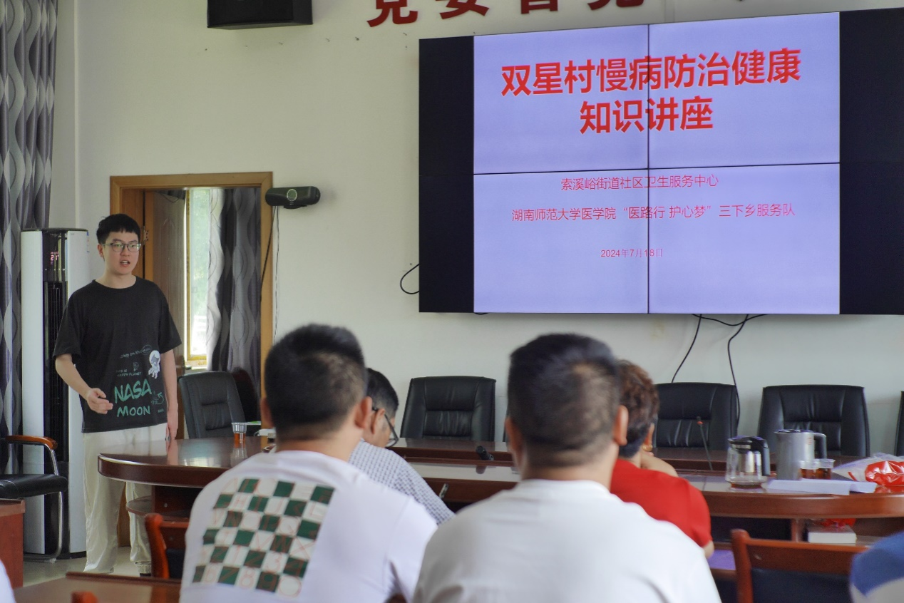 为倡导健康理念和健康生活方式,普及慢病防治的重要知识,7月19日,由永利集团官网学工由办主任张晓红老师和辅导员高国文老师带领的医学院“医路行,护心梦”暑期社会实践团在张家界武陵源区索溪峪街道9个村开展了为期5天的慢病防治健康知识讲座。此次讲座包括糖尿病、高血压和高血脂三种慢性病防治的健康知识,由实践团成员担任主讲人。