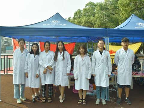 在田径场旁的医疗服务站点,爱心服务队以及心理健康协会的志愿者们准备了应对军训突发状况的药品以及饮用水。他们为中暑的新生提供藿香正气水等解暑药物,为跌倒受伤的新生处理伤口,照顾低血糖或者身体状况不佳的新生,帮助他们恢复体力。军姿时,有一位身体状态不佳的新生由班导搀扶送到服务站点。她脖子通红,脸色苍白,志愿者扶着她在遮阴棚下坐下,取下她的帽子解开她的外套,为她倒来葡萄糖水饮用,并为她讲解注意事项。同时,又有一位脚受伤的新生被教官搀扶着送来,志愿者们赶紧送他去往医务室。在休息期间,志愿者们给教官们送去润喉糖。志愿者们既发挥了医学院的优势,又让新生与来到医学院的教官感受到了学院的温暖与真情。