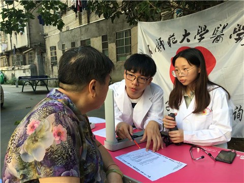 与此同时,健康咨询队队员前往石佳冲社区进行健康咨询,免费为前来的居民们量血压、测血型、测血糖。当地居民对健康咨询活动表示支持,其中,一位女士前来测血糖时,经过队员们的询问得知,她吃早餐时间未超过两个小时,所以不能测量血糖,队员们就此向这位女士普及了血压、血糖的相关知识。