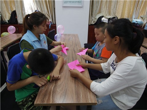 支教组来到服务中心后,分工合作,调试投影仪,吹气球折纸来布置现场,以便能创造最好的条件和环境来迎接孩子们的到来。为等待晚到的小朋友,“小老师”们带领孩子们进行趣味折纸活动,这不但开发了他们的动手能力,还培养了他们的团结精神。孩子们到齐后,在红会“三下乡”负责人何健乐的主持下,支教组的各位老师和孩子们依次进行自我介绍,增进了彼此的了解,以便后期支教工作的开展。