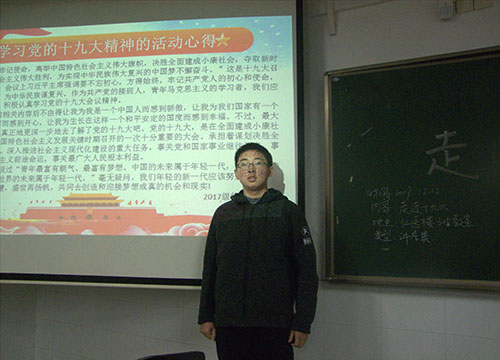 讲座伊始,与会成员一同观看中国共产党第十九次全国代表大会直播学习十九大精神,并进行了知识竞答,全体成员积极发言。此后,夏婷婷、由宁、李小雪开始了主题为十九大精神学习报告的讲座,讲座分别从新时代的定位、美丽中国的四大举措以及新征程这三个方面介绍了中国这五年的历史性变革和历史性成就,并在最后展示了优秀团员刘俐和张芝榕的学习十九大心得。讲座最后,学生代表李乐为感慨习近平总书记对国家未来的发展所构建的蓝图让他热血沸腾,并表示要努力学习,成为构建社会主义现代化和实现中华民族的伟大复兴的中流砥柱。