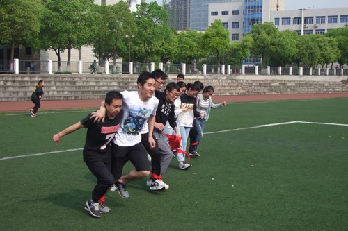 活动项目有螃蟹赛跑、企鹅漫步、争分夺秒、两人三足、旋转吧数字与趣味拔河。其中,争分夺秒和两人三足两项活动最受学子们欢迎。争分夺秒项目以四人为一组进行接力,项目规则为:一名运动员手持装满水的水杯,奔跑100米后折回原点交给下一名运动员,评分点既包括完成比赛的速度,也包括杯中剩余水的多少。运动员们有的想以速度取胜,有的想以稳重的步伐来保证水的存留,最后的成绩不相上下。两人三足项目用绑带将两名运动员的邻近脚绑在一起,运动员要凭借两人的默契与速度共同取胜。