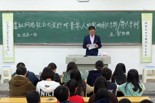 此次辩论赛的辩题是“虚拟网络社会的流行对青年人的影响的利大于弊还是弊大于利?”。正方辩手来自16级临床一班,所持观点是“利大于弊”;反方辩手来自于16级护理班,所持观点是“弊大于利”。比赛分为开篇立论、自由攻辩、攻辩小结、自由对辩、自由辩论、总结陈词六个环节。在正反双方一辩陈词后,辩论场上双方迅速进入状态,各辩手唇枪舌战,双方三辩在自由对辩时你来我往,互相提问时抓住对方措辞中的漏洞毫不退让,纷纷举出相应的例子来反击对方。在双方激烈的辩论后,紧接着即是总结陈词环节,双方四辩立足于己方观点引经据典痛击对方辩词的漏洞。