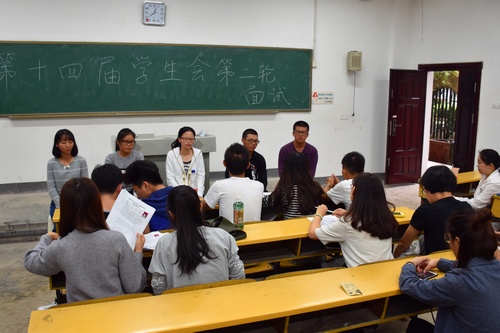 面试者分成四部分,分别在院内参加院团委、学生会、社联及青年传媒中心的面试。面试中面试者需进行具有个人特色的自我介绍,并对面试官们提出的问题作答。提问环节中的问题主要包括加入部门的理由、对部门职能的认识、在以后的工作交流上出现问题时应如何应对解决以及自身参选的优势与不足等。