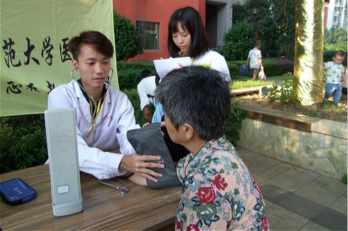 上午八点半左右,健康咨询队队员在浩龙•音乐界社区负责人的协助下,于社区空地进行摆点咨询。十多个自愿者被分成了五组,两组负责测血压、一组测血糖、一组测血型、最后一组走进社区内部进行宣传,为吸引更多社区居民。活动刚开始,前来进行咨询的居民不很多,随着活动的展开,居民慢慢地被吸引了过来。在得知自己的血型时,一位居民感叹道:“真是这么把年纪了,都不知道自己的血型,挺感谢这群学生的!”一位居民好奇血型是如何测量的,志愿者耐心地向他解答了原理,然后用日本血型分析性格特征的方法,通过一个通俗易懂的小故事,描述了A血型浪漫的特征最后赢得了群众的掌声。