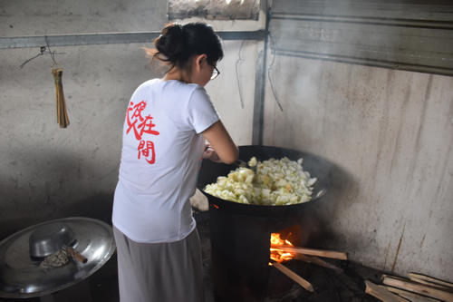 购置食材后,队员们紧接着开始做饭。队员分成四组,在做饭阿姨陈金燕的指导下,有条不紊地生火、蒸饭、洗菜、切菜、炒菜。“第一次做大锅饭,铲起菜来很是吃力,但为了让孩子们吃到菜,还是坚持把菜做好。”负责炒菜的张睿说道。厨房里的温度较高,生火、炒菜的队员个个汗流浃背,其他队员见状跑上前为其扇风。