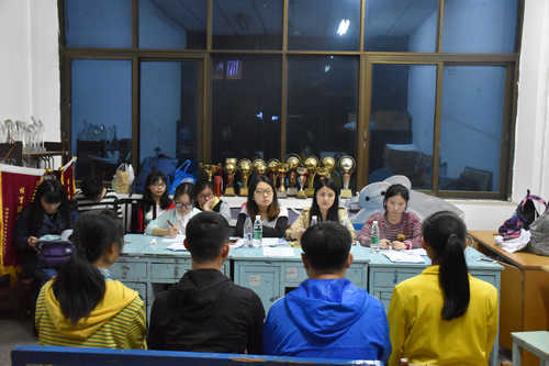 面试者分成四人一组,在面试中向评委进行具有个人特色的自我介绍,并对评委们提出的问题作答。提问环节中评委提问主要包括对部门的认识(包括部门内部现存问题以及未来的发展构想)、课业与工作如何协调把握、在以后的工作交流上出现问题时应如何应对解决以及自身参选的优势与不足等。