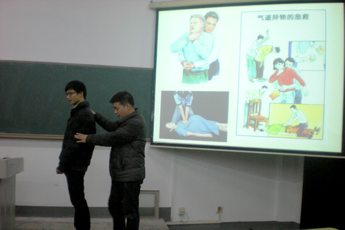 讲座由来自长沙市红十字会的老师姜新任担任主讲人。他首先提出两点看法,即“思考为什么要学习紧急救护知识”和“要学会去分享紧急救护知识”。随即,他谈到此次讲座的主要内容是“救护新概念”,而其中又以“新”为重。他认为紧急救护的普及应首先重在观念和意识的改变,其次才是专业知识的传播。