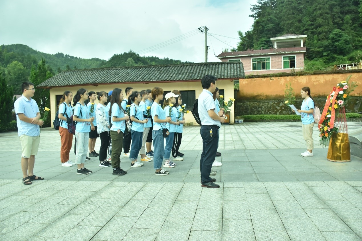 暑期实践团队队员首先到达毛泽东脱险地旧址观光,在为毛泽东献花仪式前,团队队长刘乔献上花篮,发言表达了对毛泽东同志的敬仰,随后带领所有队员分组依次向毛泽东雕像献花。