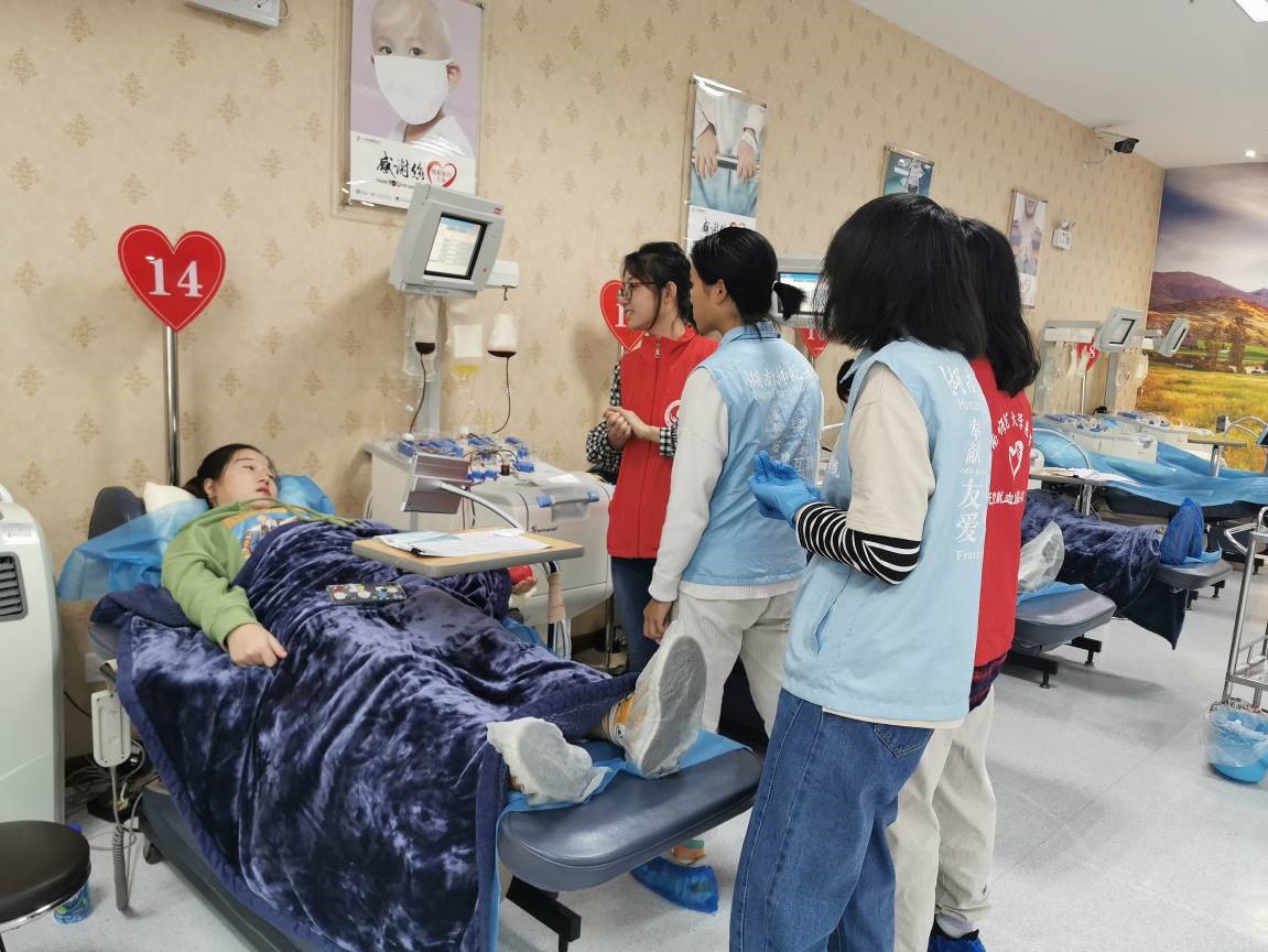 在活动负责人杨艳君的带领下,全体成员到达长沙血液中心。献血者首先进行个人信息登记,在依次接受血压测定,血型测定与静脉采血初筛后,血液合格的志愿者可以来到献血区进行血小板的采取。负责宣传和引导志愿者在经过简短的培训后,一部分在献血区外引导志愿献血者进行信息登记与血液检查,并为采血结束的献血者提供服务;另一部分在献血区内帮助工作人员管理相关器材,指导献血者进行采血前的准备。活动过程中,活动中心工作人员们表示,志愿者的认真工作,为繁忙的血液中心带来了极大的帮助。