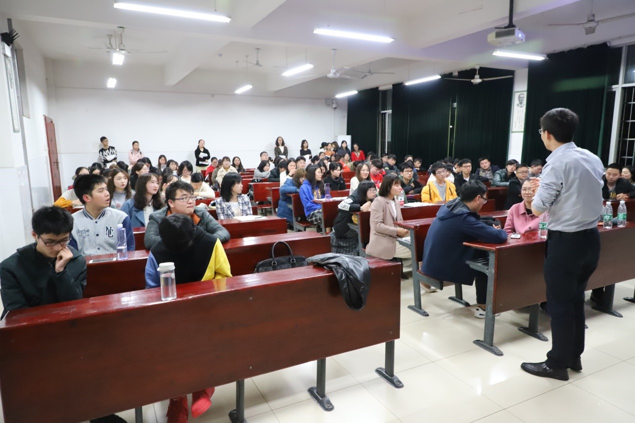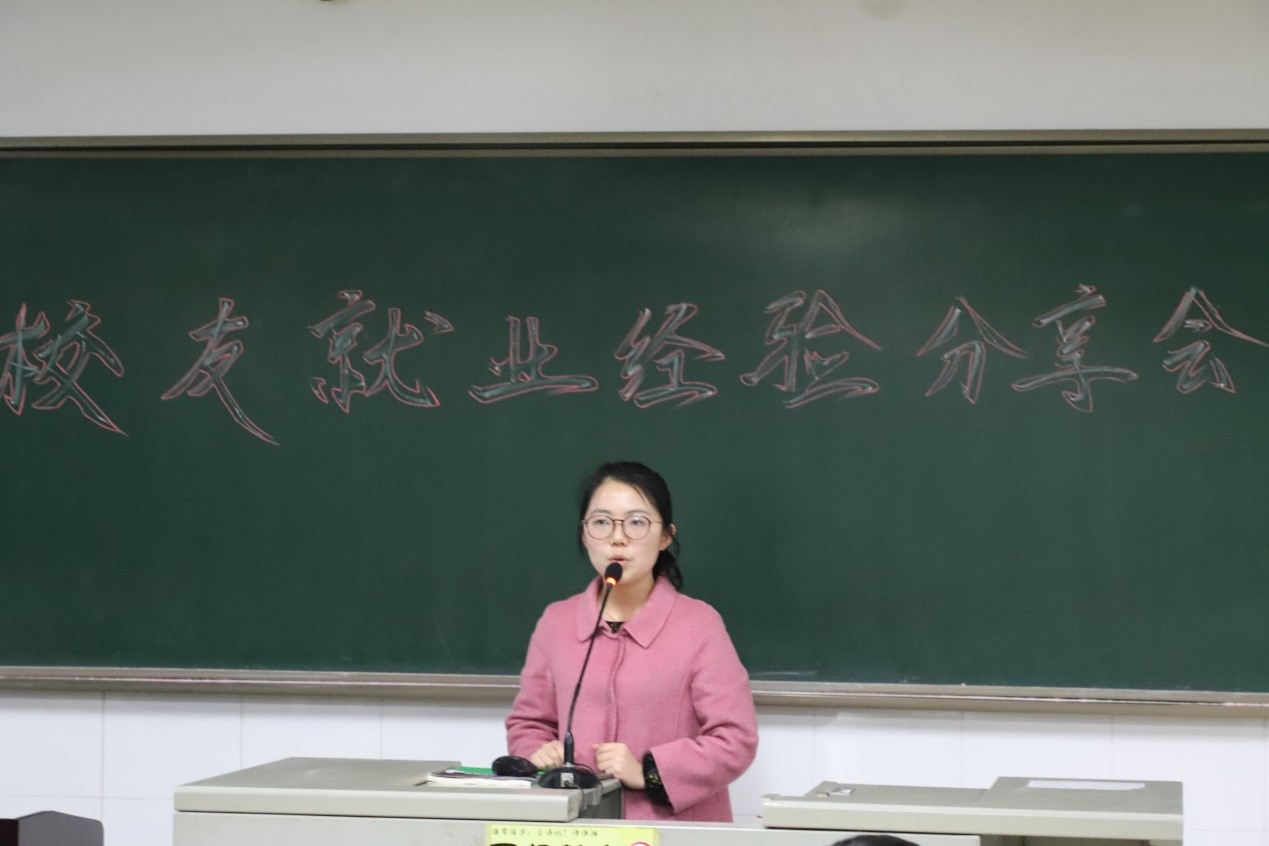 李强老师对邀请来的学长学姐进行了简单的介绍后,沈维正学长首先上台讲述了自身的就业经历,他以贴近生活的例子将其在就业期间坚持不懈、吃苦耐劳的精神传授给台下的预防班学生们,并告诫同学们要“耐得住寂寞”,勿轻言放弃。