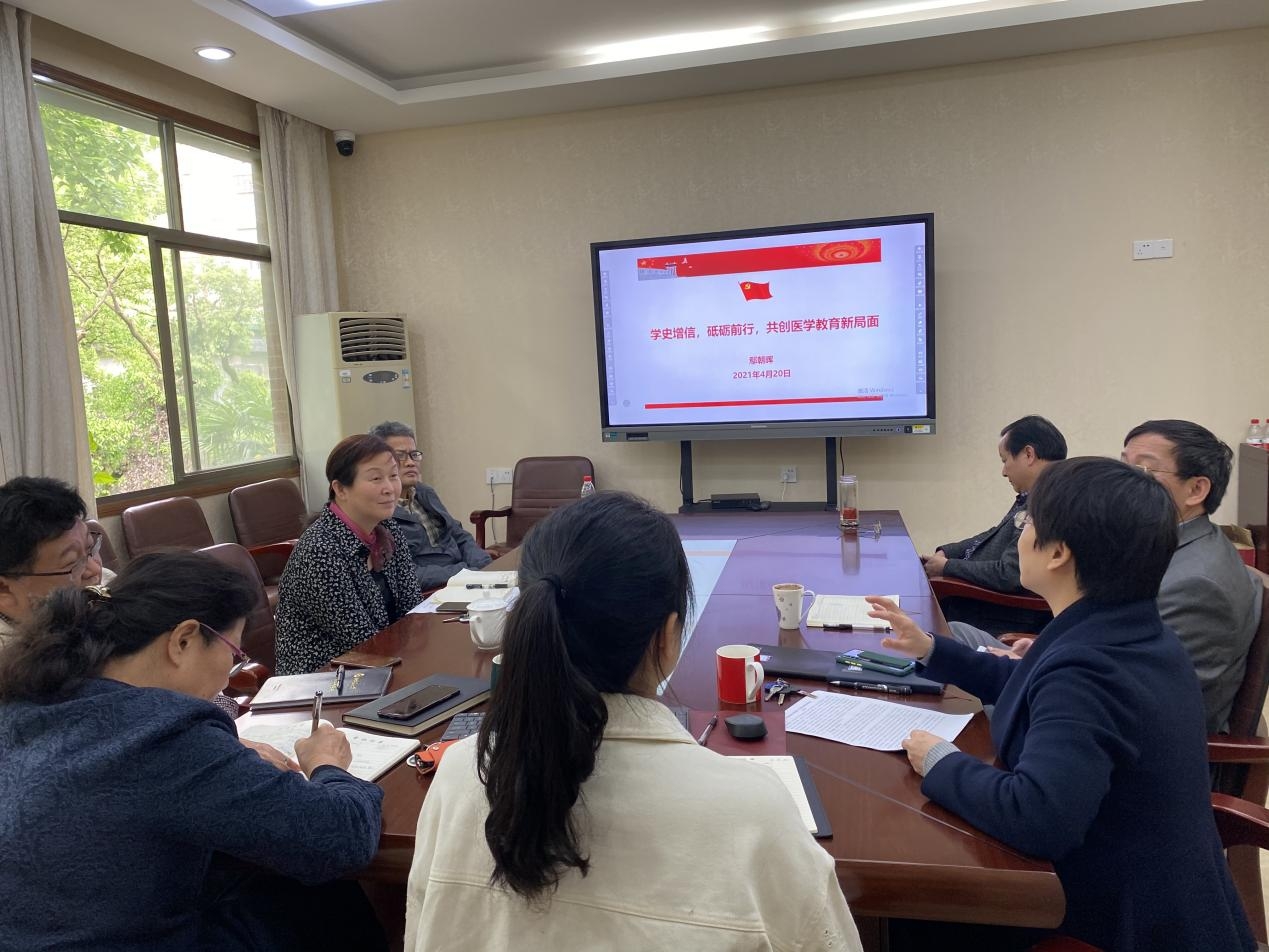 党委书记鄢朝晖以《学史增信 砥砺前行 共创医学教育新局面》为题作中心发言。她指出,历史是最好的借鉴,历史是最好的老师,通过重温红色记忆,从党史中汲取前进的智慧力量,党员干部要始终不忘初心,牢记使命,要通过学党史,进一步增强中国特色社会主义道路自信 、理论自信、制度自信、文化自信,做马克思主义的坚定信仰者。