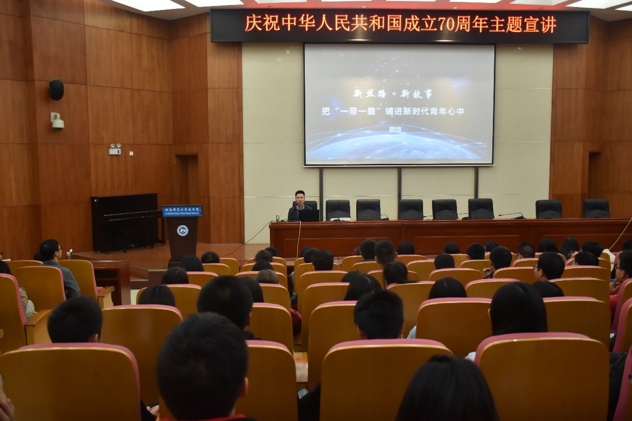 10月25日晚七点半,永利集团官网在仁医楼学术报告厅举办庆祝中华人民共和国成立70周年主题讲座,宣传部副部长蔡颂应邀主讲“新丝路·新故事:——把‘一带一路’铺进新时代湖湘青年心中”,院党委书记鄢朝晖出席此次讲座,团委书记(代)张明明主持讲座。
